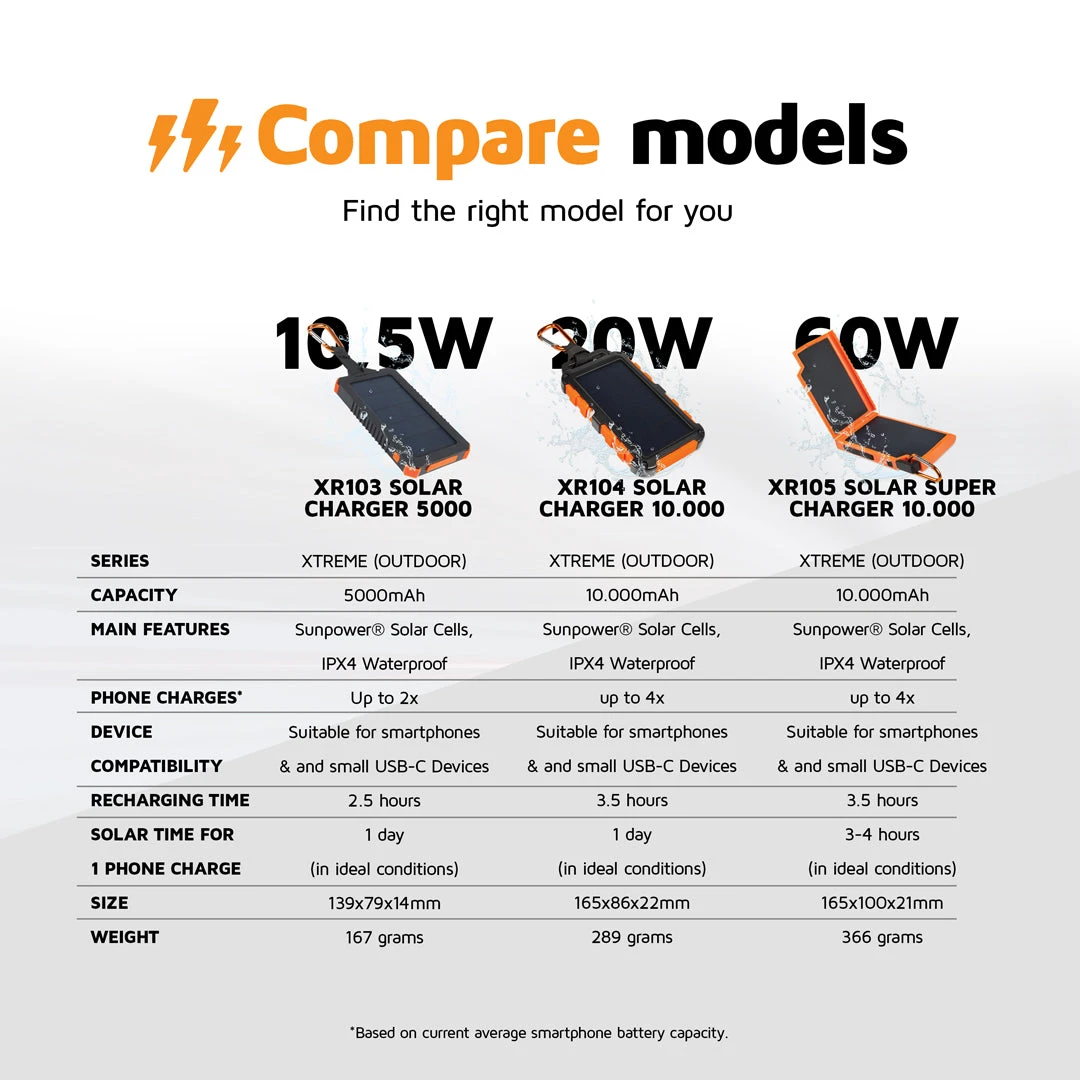 Bei Xtorm verwenden wir hocheffiziente SunPower-Solarzellen, um auf kleiner Fläche so viel Strom wie möglich zu erzeugen. Sind die oben angegebenen Ladezeiten für Sie nicht kurz genug? Keine Sorge, bei Xtorm haben wir Solarladegeräte und Panels in allen Größen. Sehen Sie sich auch unsere anderen Produkte an, um zu ermitteln, welches für Sie am besten geeignet ist!